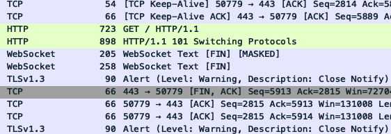 실제로 WebSocket 서버로 패킷을 보내고는 있었다. 그런데 연결 시도시 바로 끊어지는 것을 확인했다. (FIN, ACK)