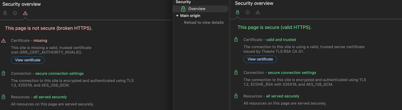 WebSocket 연결시 wss 프로토콜을 사용하고 있었기에 ssl 인증서가 유효한지 확인했다. https 기반 통신으로 ssl/tls를 사용해 암호화되기에 인증서에 문제가 있다면 브라우저에서만 연결 실패가 되는 것도 일리가 있었다. (postman에서는 인증서에 대해 신경쓰지 않기 때문이다.)